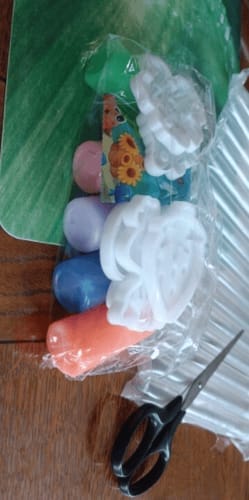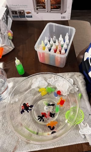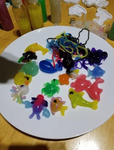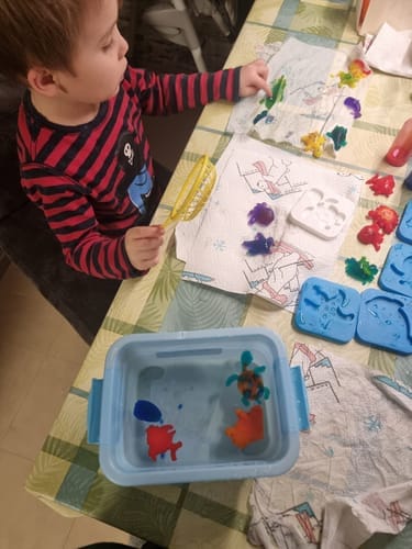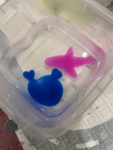 إنه مذهل، سأترك بعض الصور! تأتي بعض كرات الجيلاتين، وضعت 10 كرات في كوب من الماء واهتزت حتى تذوب. بعد أن تذوب، تضع الطلاء في القالب ثم تغمره في هذا الماء، فقط حرك الشكل الذي يخرج الرسم في ثوانٍ، ثم تخرج من هذا الماء مع الجيلاتين وتضعه في ماء نظيف، الرسومات تنمو في الماء. وجدته ممتعًا جدًا، ومحفزًا لابني البالغ من العمر عامين، قمنا بعمل سمكة ووضعناها في حوض الاستحمام...