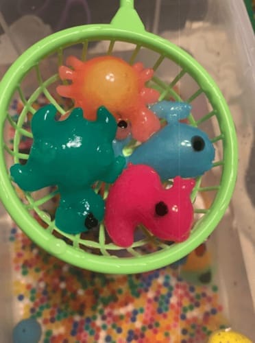 هذه المجموعة مصنوعة بشكل جيد جدًا. أحب أنها تحتوي على حاوية تخزين خاصة بها. لعبنا لساعات، مرارًا وتكرارًا. يقول لك الحس السليم أنه إذا كنت تريد أن تدوم الألوان، فلا تفرط في تحميل القوالب في كل مرة. لم نفقد أي لون حتى الآن! نترك الكرات في المحلول طوال الليل لضمان أن الداخل يتجمد بشكل صحيح. يستغرق الأمر بعض الوقت ليتمكنوا من الضغط واللعب بها، وهو ما قد يكون صعبًا شرحه للأطفال الأصغر سنًا. بيض الديناصور وخرز الماء هما مكافأة إضافية. أوصي بشدة! متعة لجميع الأعمار.